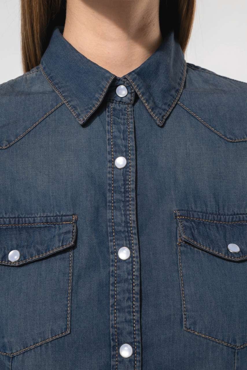 Košile z enzymy oprané bavlny nabízí vypasovaný styl, ozdobné cvočky a dvě kapsy s klopami. Přední a zadní výztuhy a manžety s patenty zajišťují pevnost a trvanlivost. Vhodné jako základ pro firemní značení. Objevte možnosti, které tento textil nabízí.