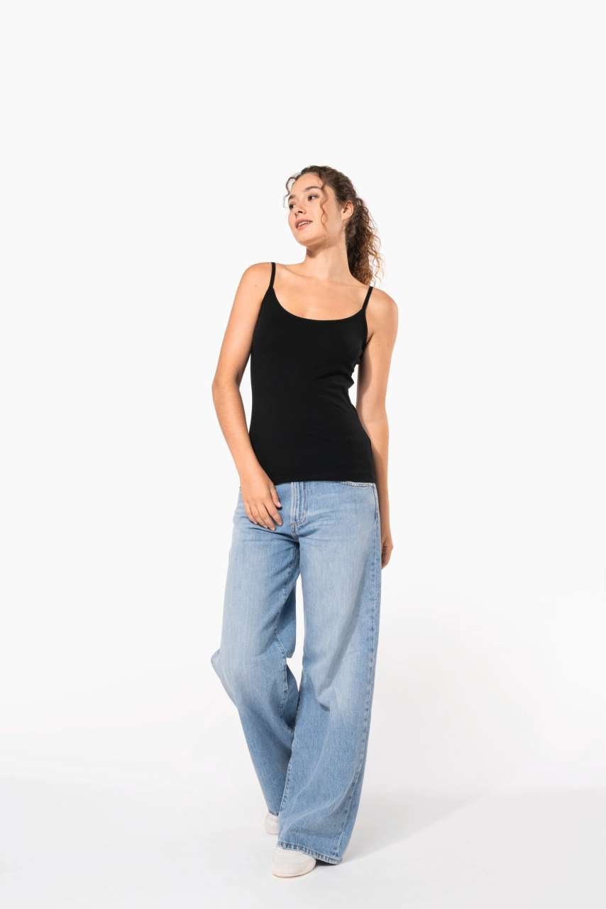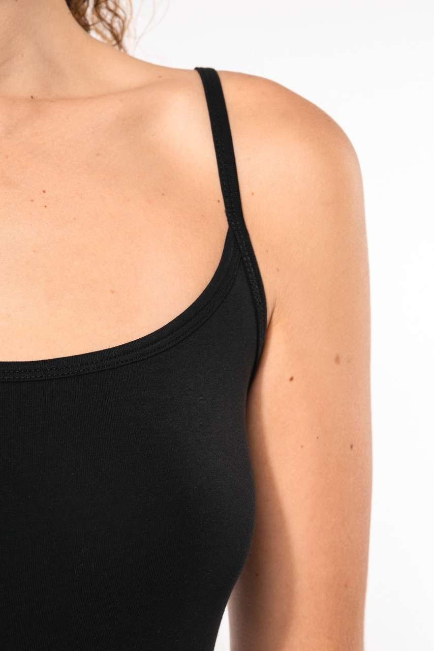 Tento dámský top s tenkými ramínky je vyroben z jemné pleteniny Jersey z česané bavlny s přídavkem elastanu, což zajišťuje pohodlný a přiléhavý střih. Vhodné jako základ pro firemní značení, ideální pro reklamní textil a merchandising. Zvažte jeho využití pro sjednocení týmu.