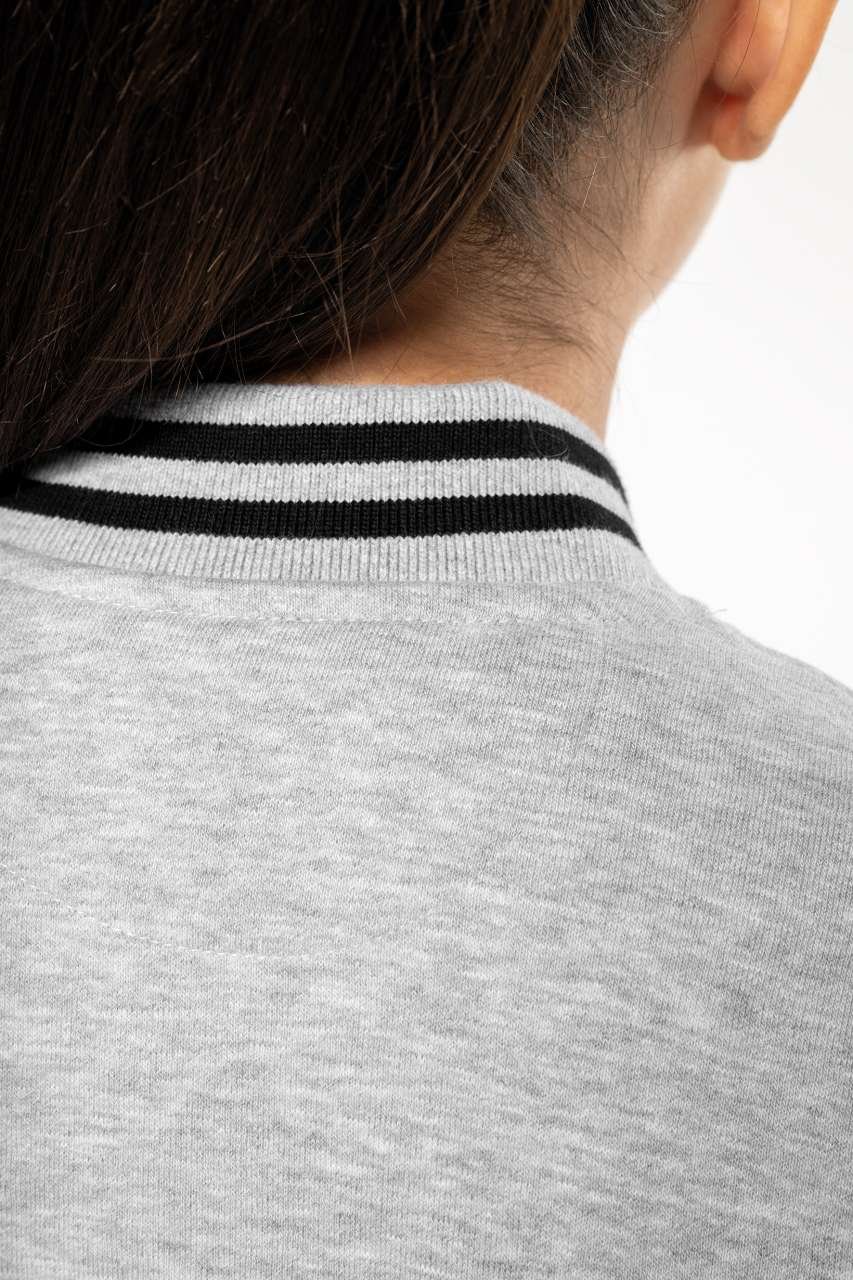 Žebrovaný průkrčník, rukávy a spodní lem s kontrastními proužky.
