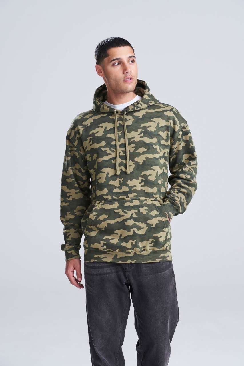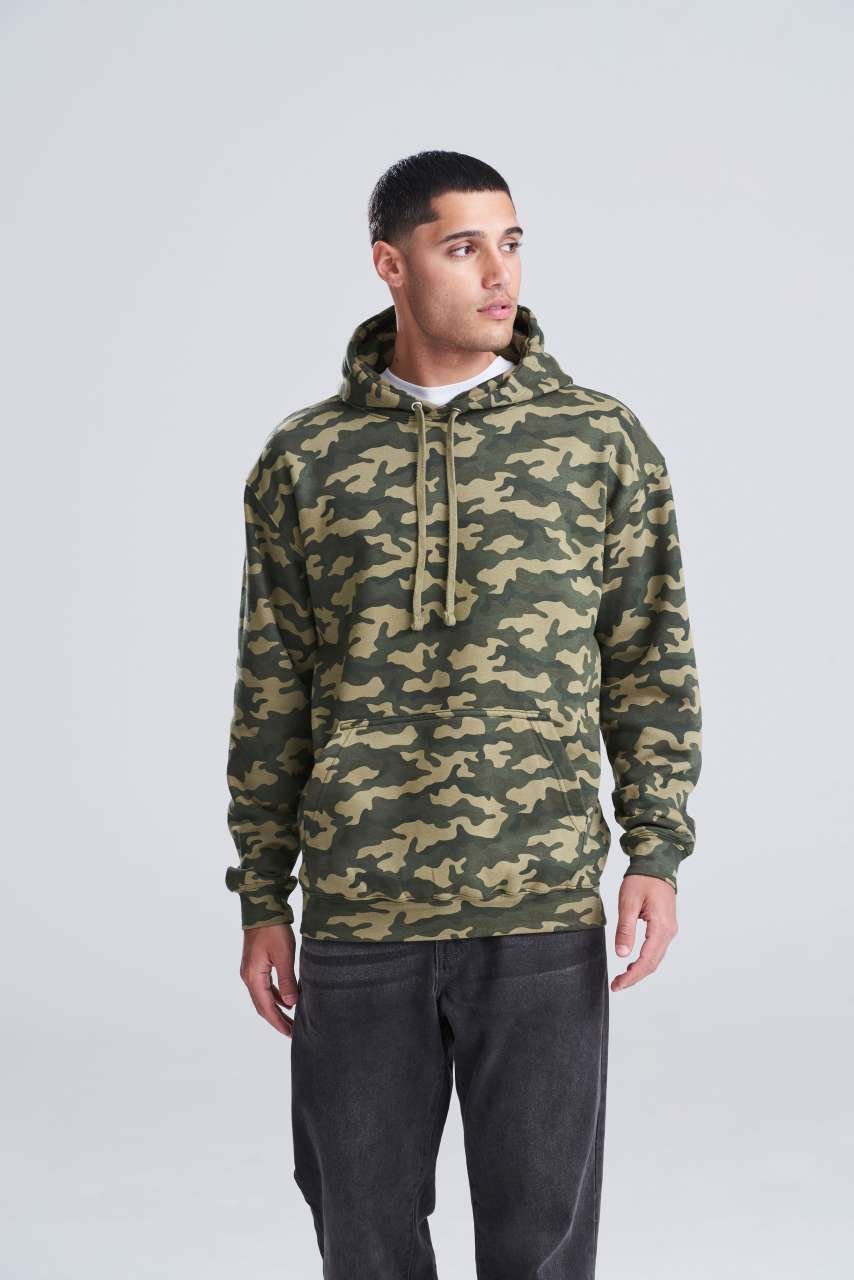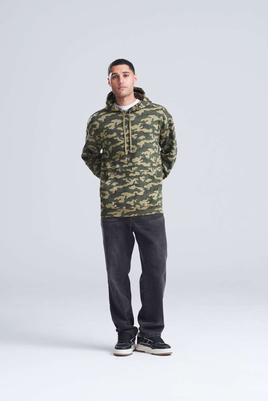 Volný střih s klasickým celoplošným maskáčovým potiskem a dvojitou látkovou kapucí poskytuje komfort pro firemní oblečení či merchandising. Klokaní kapsa přidává praktičnost. Vhodné jako základ pro firemní značení. Udržujte tým sjednocený s touto efektivní volbou.