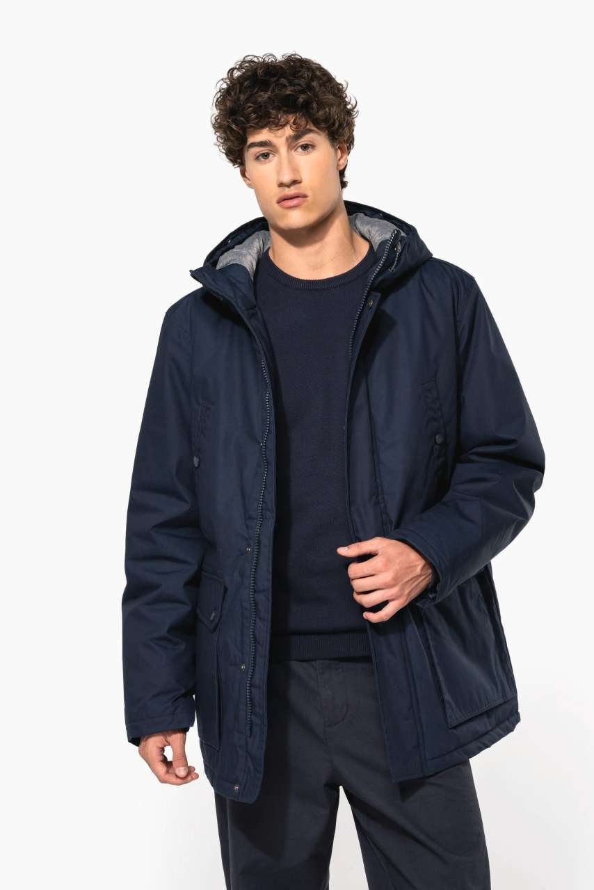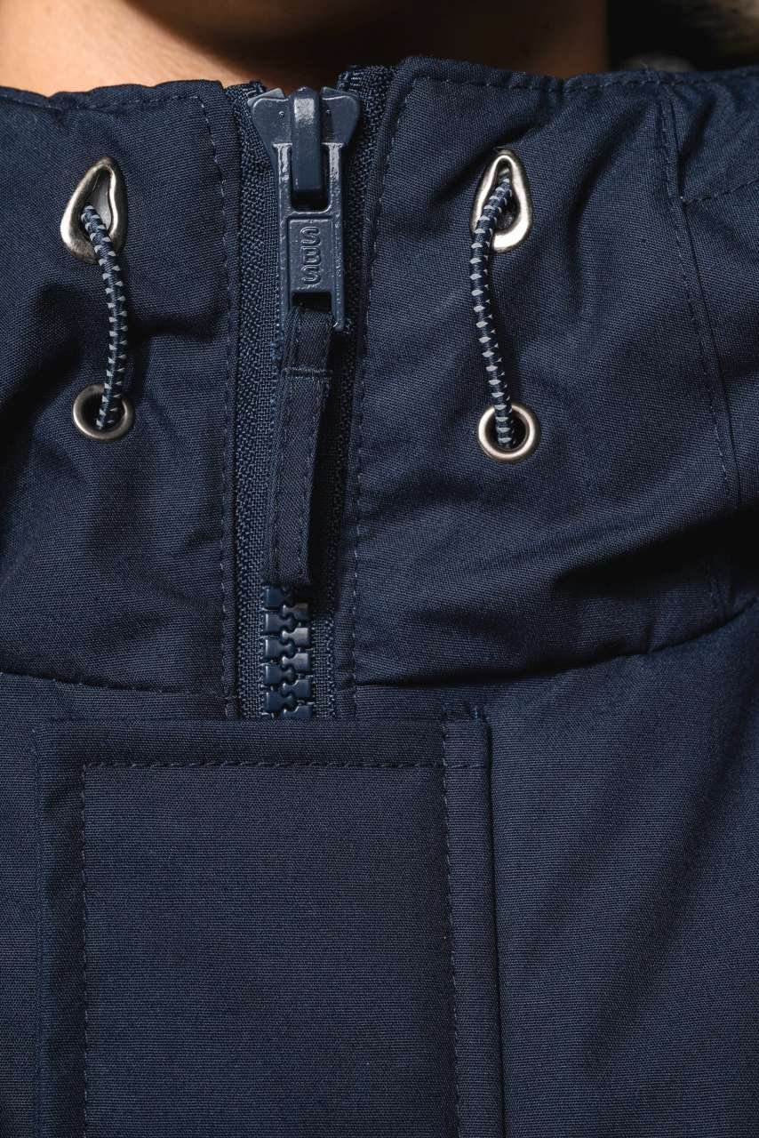 Silné plátno z 65 % z polyesteru / 35 % z bavlny Polstrovaná podšívka z 100 % z polyesteru Zapínání na zip skryté pod légou a s cvočky Podšitá a polstrovaná kapuce s odepínatelnou umělou kožešinou 4 vnější přední kapsy: 2 velké dvojité otevírací kapsy s klopami a cvočky a 2 náprsní kapsy s lemováním …