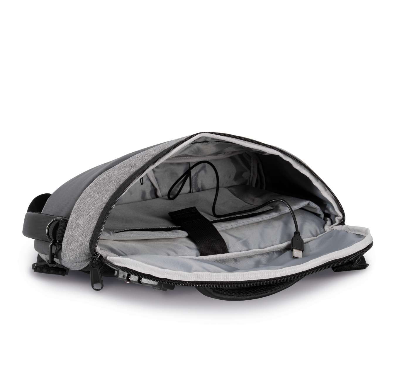 1 boční kapsa s integrovaným portem USB a vnitřním micro-USB kabelem (je součástí dodávky) pro připojení k power bance.